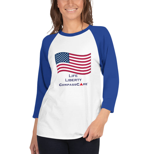 Celebrate America and CompassCare in this 3/4 sleeve raglan shirt