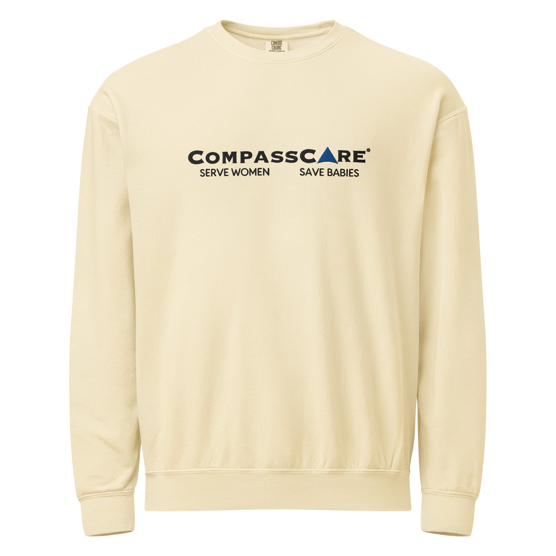Add an instant vintage touch to your wardrobe with this garment-dyed fleece crewneck. Its soft, midweight cotton fabric and relaxed fit make it perfect for everyday wear. Each piece has subtle color variations that create a unique, lived-in look. Embroidered with the CompassCare logo and mission: Serve Women. Save Babies.